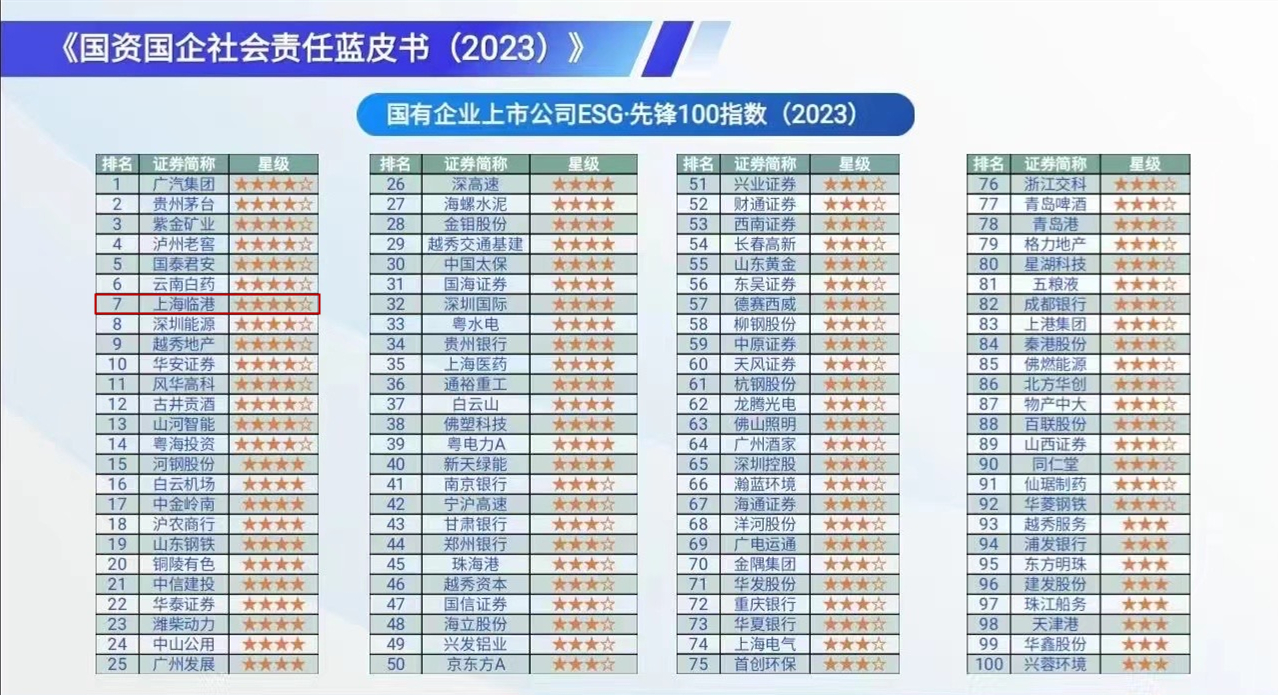 临港集团旗下上海临港控股公司(600848.SH)入选“国有企业上市公司ESG·先锋100指数(2023)”榜单,排名第7位。