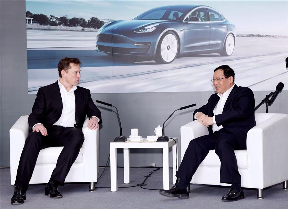 Shanghai Mayor Ying Yong, right, and Tesla CEO Elon Musk launch the opening of the Tesla China-made Model Y program during the delivery of Model 3 cars to buyers yesterday.