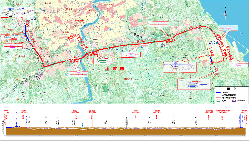 机场联络线全长68.6公里,最高设计时速160公里,共设虹桥站、七宝站、华泾站、三林南站、张江站、度假区站、浦东机场站、浦东机场规划航站楼站、上海东站等9座车站。其中,浦东新区范围内6座车站,线路长度约占总长度的三分之二。