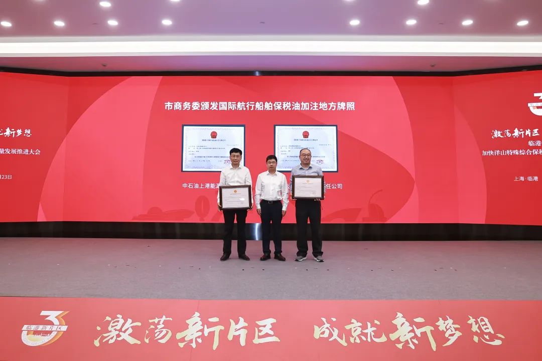 活动上,首批国际航行船舶保税油加注地方牌照企业获颁资质证书。洋山港每年挂靠集装箱船舶万余艘次,链接全球200多个重要港口。此次国际航行船舶保税油地方牌照的颁发,将有利于提高港口服务能级,助力上海国际航运中心从基本建成向能级提升跨越。