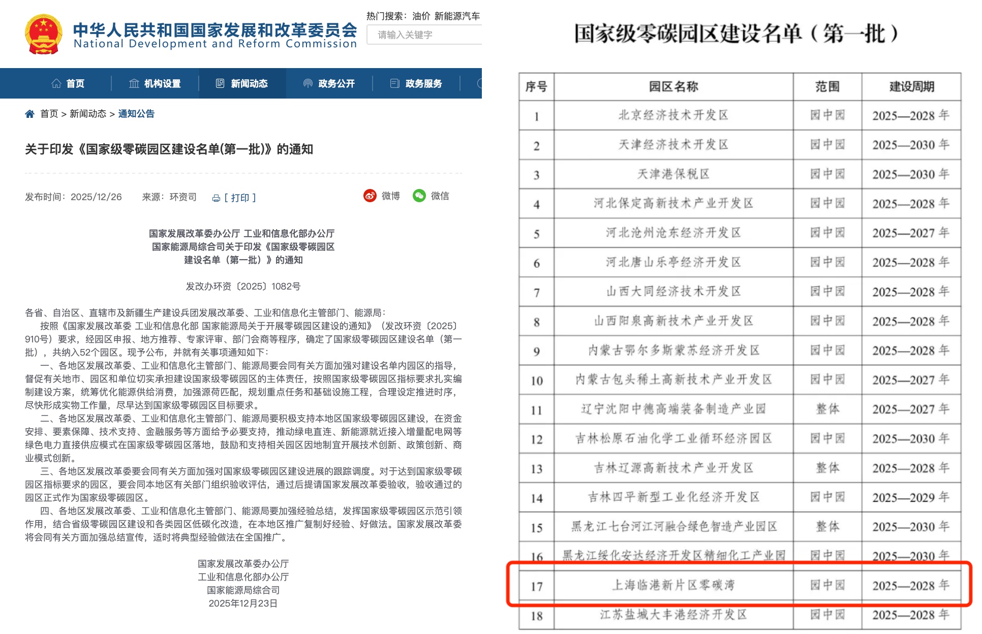 12月26日,国家发展改革委办公厅、工业和信息化部办公厅、国家能源局综合司联合发布《国家级零碳园区建设名单(第一批)》(发改办环资〔2025〕1082号),上海临港新片区零碳湾成功入选,成为全国首批52个国家级零碳园区之一,上海市目前首个并且唯一获批的国家级零碳园区。这是临港集团积极落实国家“双碳”战略、推动园区绿色低碳高质量发展进程中的重要里程碑。
