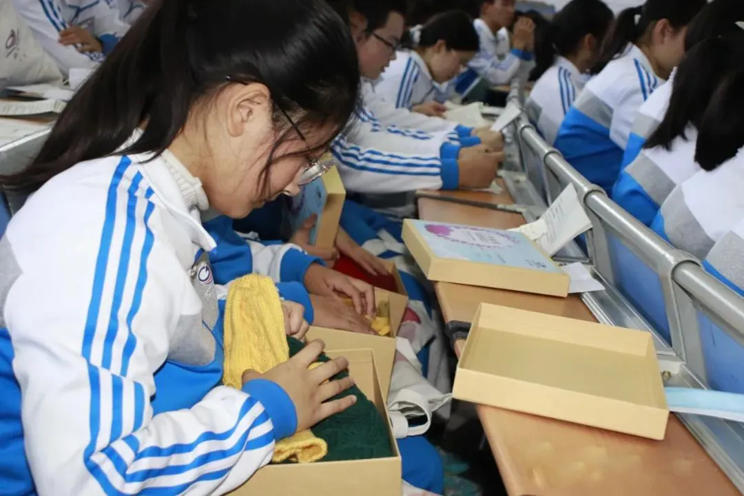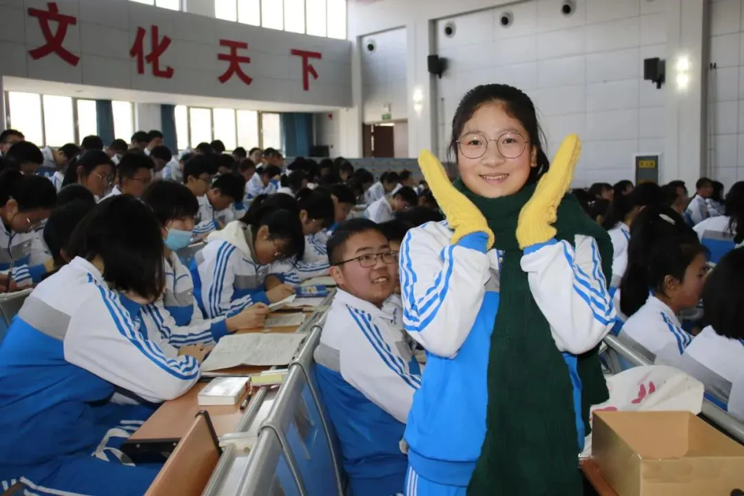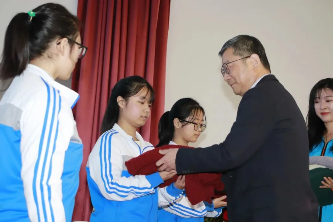 平邑一中党委委员、西校区校长李景元代表学校向王春华赠送锦旗;王春华为2020级临港杉树社团学生代表赠送由基金会资助的独居老人们赶织的爱心围巾和手套,向同学们传递社会的温暖和能量。