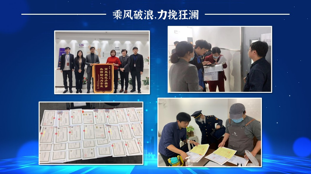 关键时候,作为业务骨干,他秉承工作室“服务无极限,真诚到永远”的服务理念,坚持“勇于突破新难特急问题”的工作态度。一方面继续紧盯商户装修进度,一方面指导商户准备相关材料,另一方面依托于支部共建所建立下的信任和默契,多次主动邀请相关审批部门,组织召开云廊商户现场答疑会,提前预审图纸、集中看场地,硬是将1个月的正常办证周期缩短到了3天,甚至是1天,用15天完成了24家商户相关许可证的办理。所有流程环环紧扣、分秒必争,确保了云廊能够证照齐全如期开业。刷新了办证新速度、提升了服务新高度。