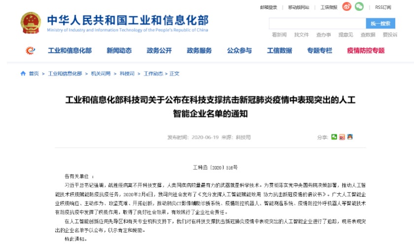工业和信息化部科技司关于公布在科技支撑抗击新冠肺炎疫情中表现突出的人工智能企业名单的通知