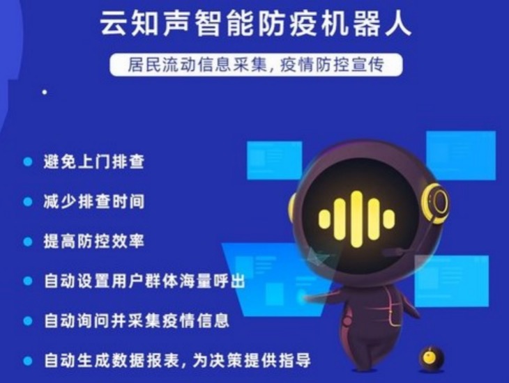 人工智能企业云知声具备业界领先的语音识别、语义理解技术,由云知声的开发智能防疫机器人,能够提供人工智能电话外呼服务,协助社区自动采集信息。在90路并发的条件下,平均每通2.5分钟(包含用户振铃、失败重呼、线路异常等),一天打满10小时,呼叫量最高可达25800通。人工智能外呼系统能够自动对发热、有呼吸道症状、从疫情重点地区返回的居民进行标注,并自动生成排查图文报告,为街道社区疫情防控工作提供了重要的参考。云知声智能防疫机器人陆续在北京海淀区西三旗街道、上海徐汇区、厦门湖里区金山街道、泉州安溪县、三明尤溪县等多个地区、街道上线提供服务,接通率最高超过90.28%,大大减轻了街道社区工作人员的负担。