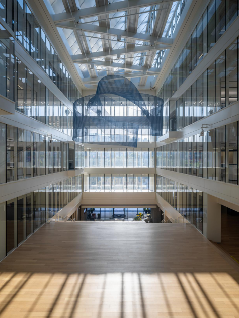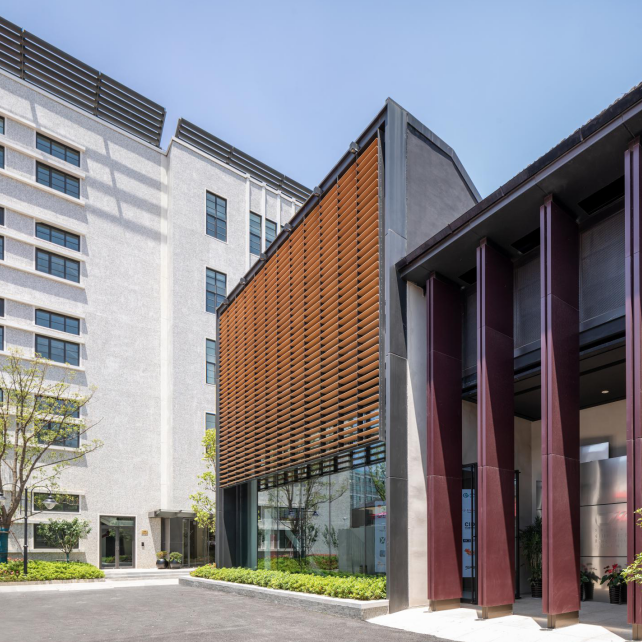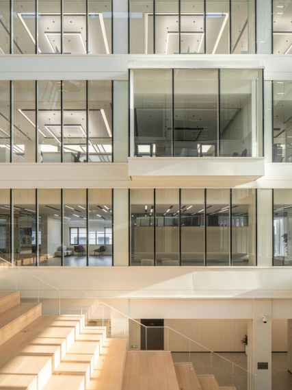现在已是中以创新园展示中心和商务中心的18#楼(首发智能楼宇),曾经是一个封闭的U形厂房空间。在焕新设计中,锯齿状的中央天窗和通透的玻璃幕墙联接起来,形成极具艺术张力、空间视野宽绰的中庭。在这里,具有标志性的一系列宽广台阶,形成了可以商务休憩、自由交流的空间,显示出对社交导向公共空间的精心考量。颁奖词写道:“在这个以人为中心的环境里,呈现出了令人赞叹的设计美学,以及一个由中国快速发展的工业化历史和新技术结合形成的标志性案例。”(链接:崭露“先行者”风采!首发智能楼宇载誉亮相)