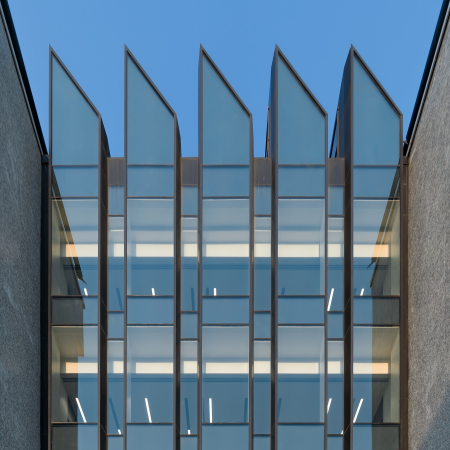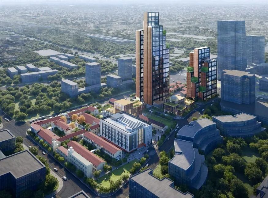 项目将“轻触”这一概念,从保留建筑的修缮改造自然过渡、融入进总建筑面积12万㎡的新建建筑中,形成新老建筑和谐共生又各有风姿的特色面貌。新建部分是从保留部分生发出来的建筑,两栋高度分别约为150米和100米的塔楼,诠释“生长型建筑”的内涵,既延续保留部分的建筑肌理,更寓意历史步入当代的升华和进取。高层塔楼的退台设计与晶莹剔透、充满现代科技感的玻璃幕墙相结合,形成主题鲜明、节节拔高的“水晶王冠”形象。颁奖词中写道:“新建部分的建筑体量比历史建筑大很多倍,但是依旧采用了和历史建筑相同的设计语言,创造了城市独特的天际线和地标。”(链接:英雄再展风采,B区塔楼获LEED-CS金级预认证)