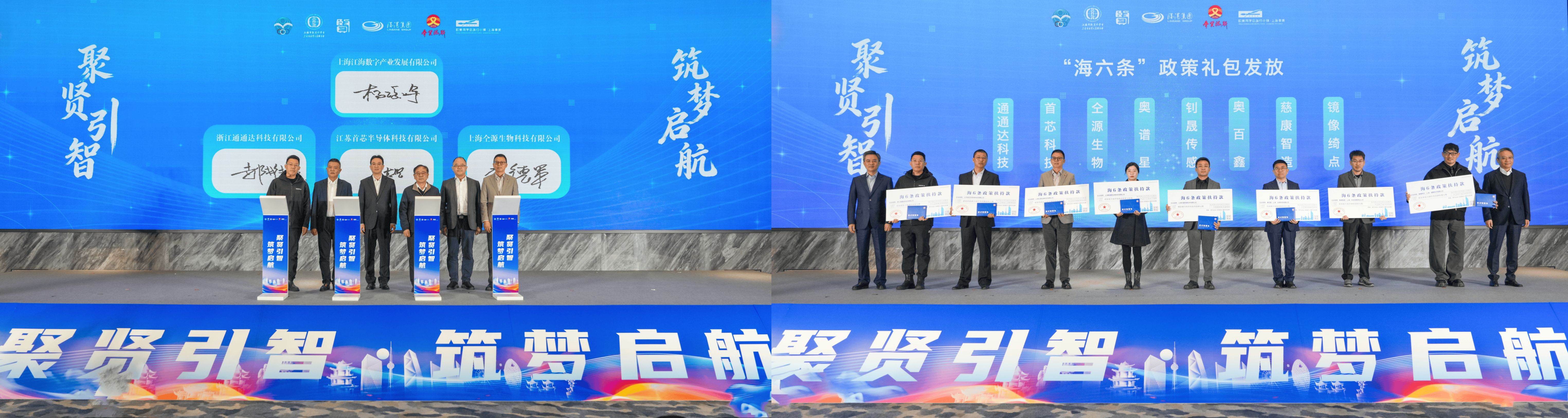 如今,海归小镇紧密围绕主导产业,开展精准招商与产业生态培育。活动上,浙江通通达科技有限公司、上海仝源生物科技有限公司、江苏首芯半导体科技有限公司等3个亿元项目,以及上海钊晟传感技术有限公司、奥百鑫(上海)生物科技有限公司、上海奥谱星生物科技有限公司、慈康智造(上海)科技有限责任公司、镜像绮点(上海)细胞技术有限公司等5家企业与江海数字公司进行签约;奉贤区领导向签约企业颁发“海六条”政策大礼包。